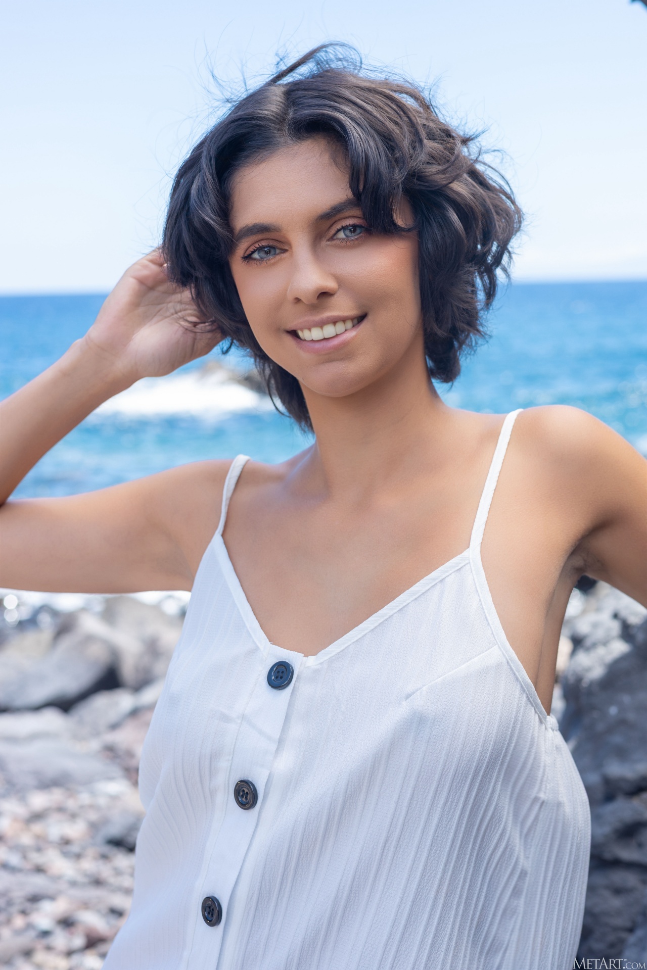 Enchanting blue-eyed beauty Kensi enjoys a rocky escape on a wild rocky shore, the ocean breeze catching her buttoned dress and blowing it open to expose her perfect breasts and beautiful lithe body …